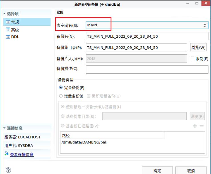 backup tablespace MAIN full backupset '/dm8/bak/tablespace'; #表空间备份