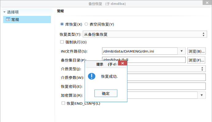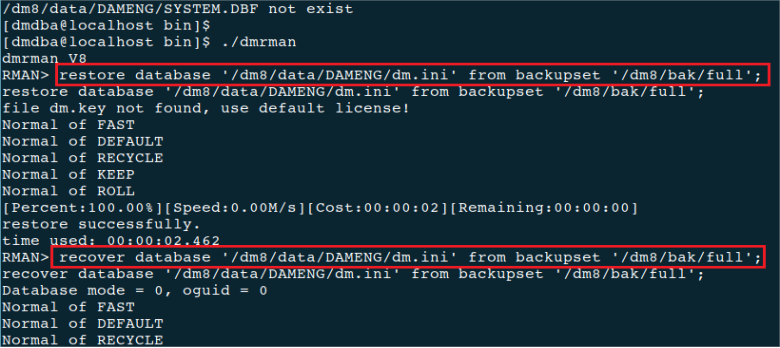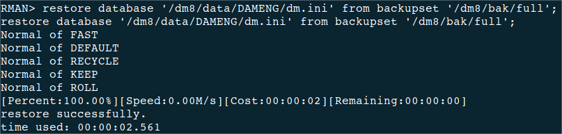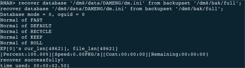 RMAN> recover database '/dm8/data/DAMENG/dm.ini' from backupset '/dm8/bak/full';