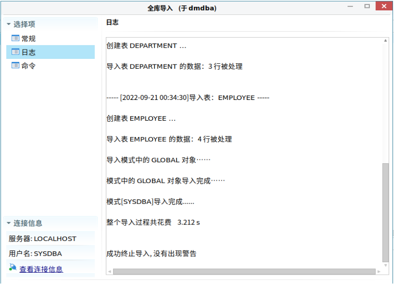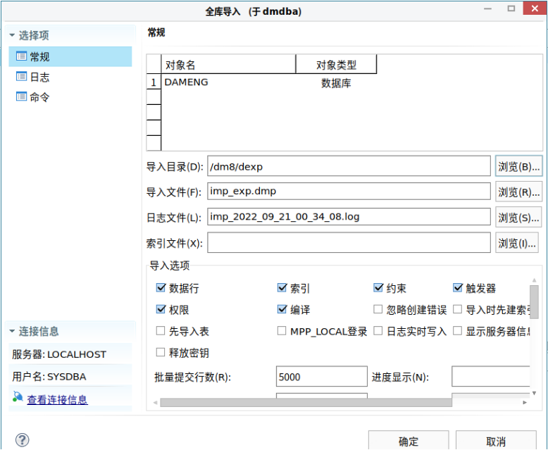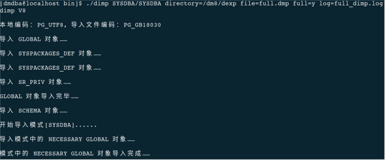 ./dimp SYSDBA/SYSDBA directory=/dm8/dexp file=full.dmp full=y log=full_dimp.log