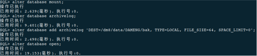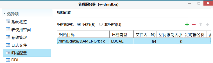 alter database add archivelog 'DEST=/dm8/data/DAMENG/bak, TYPE=LOCAL, FILE_SIZE=64, SPACE_LIMIT=0';