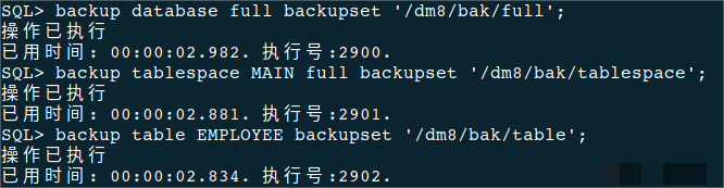backup table EMPLOYEE backupset '/dm8/bak/table'; #表备份