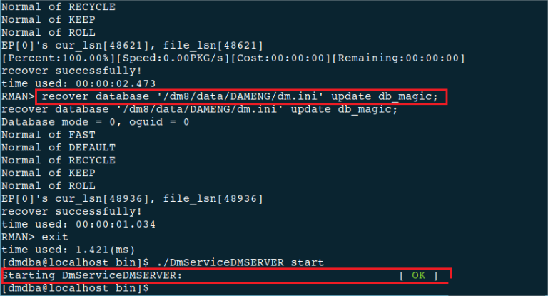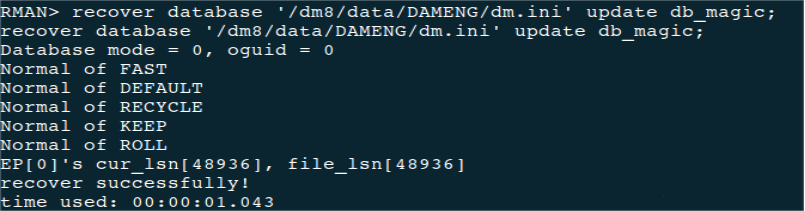 RMAN> recover database '/dm8/data/DAMENG/dm.ini' update db_magic;