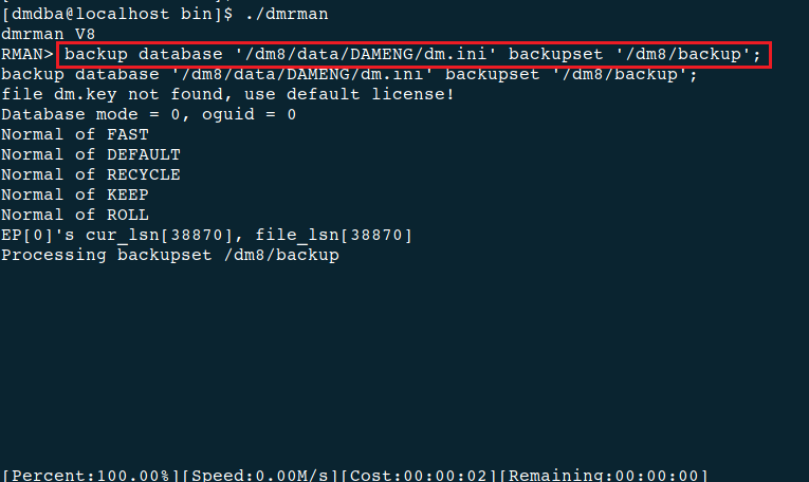 RMAN> backup database '/dm8/data/DAMENG/dm.ini' backupset '/dm8/backup';
