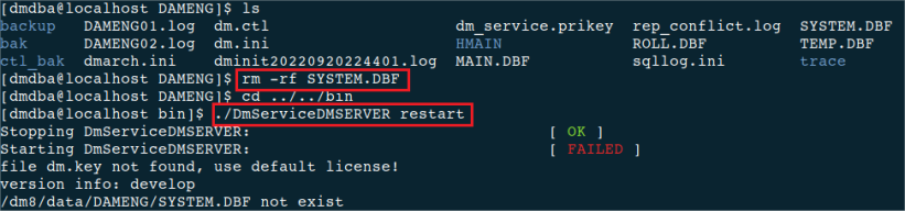 删除数据文件SYSTEM.DBF,然后重启数据库,可以看到数据库启动失败,原因是数据文件/dm8/data/DAMENG/SYSTEM.DBF不存在