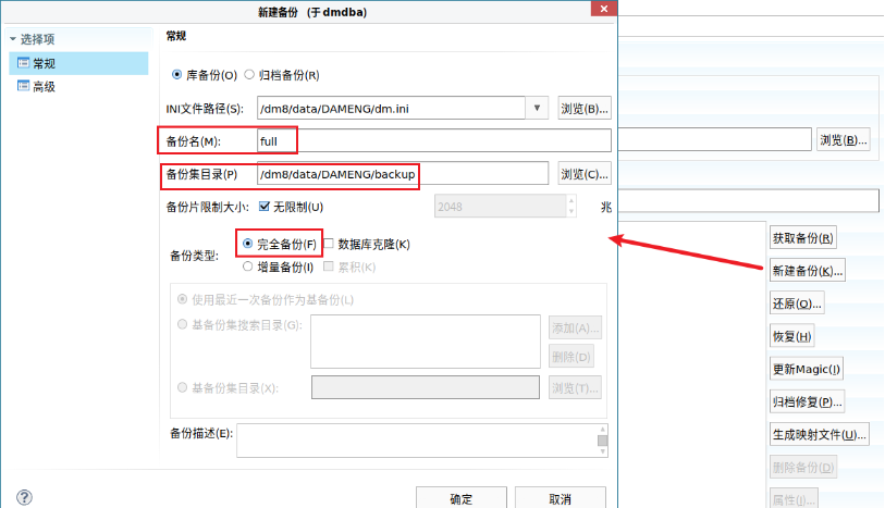 前提条件:开启数据库服务和dmap服务,且启动dmap的用户和启动DM服务的用户必须一致,否则会导致备份失败
