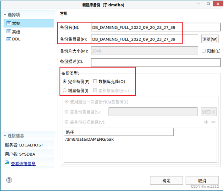 可以指定备份集目录和备份名,可以选择备份类型,这里均为默认,默认路径/dm8/data/DAMENG/bak