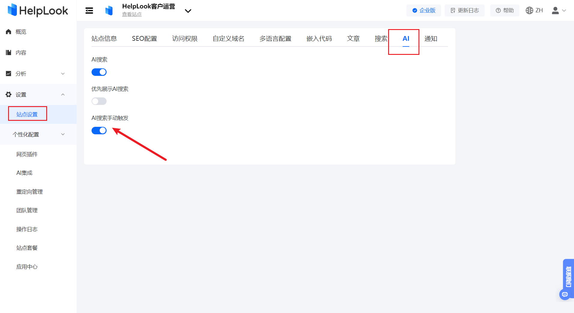 【查看路径】:点击后台设置->站点设置->AI,选择“AI搜索手动触发”。