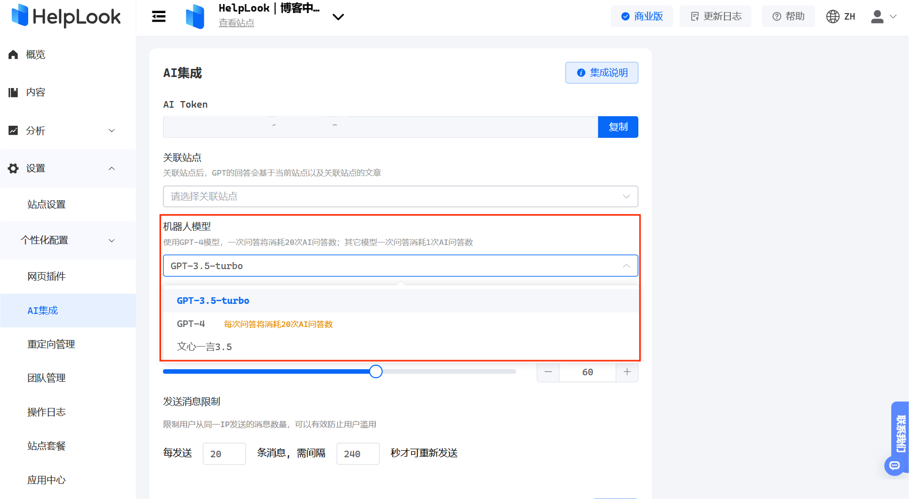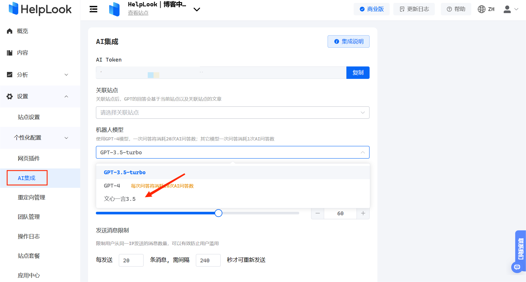 【查看路径】:点击后台设置->AI集成,找到“机器人模型",点击即可选择文心一言3.5模型。