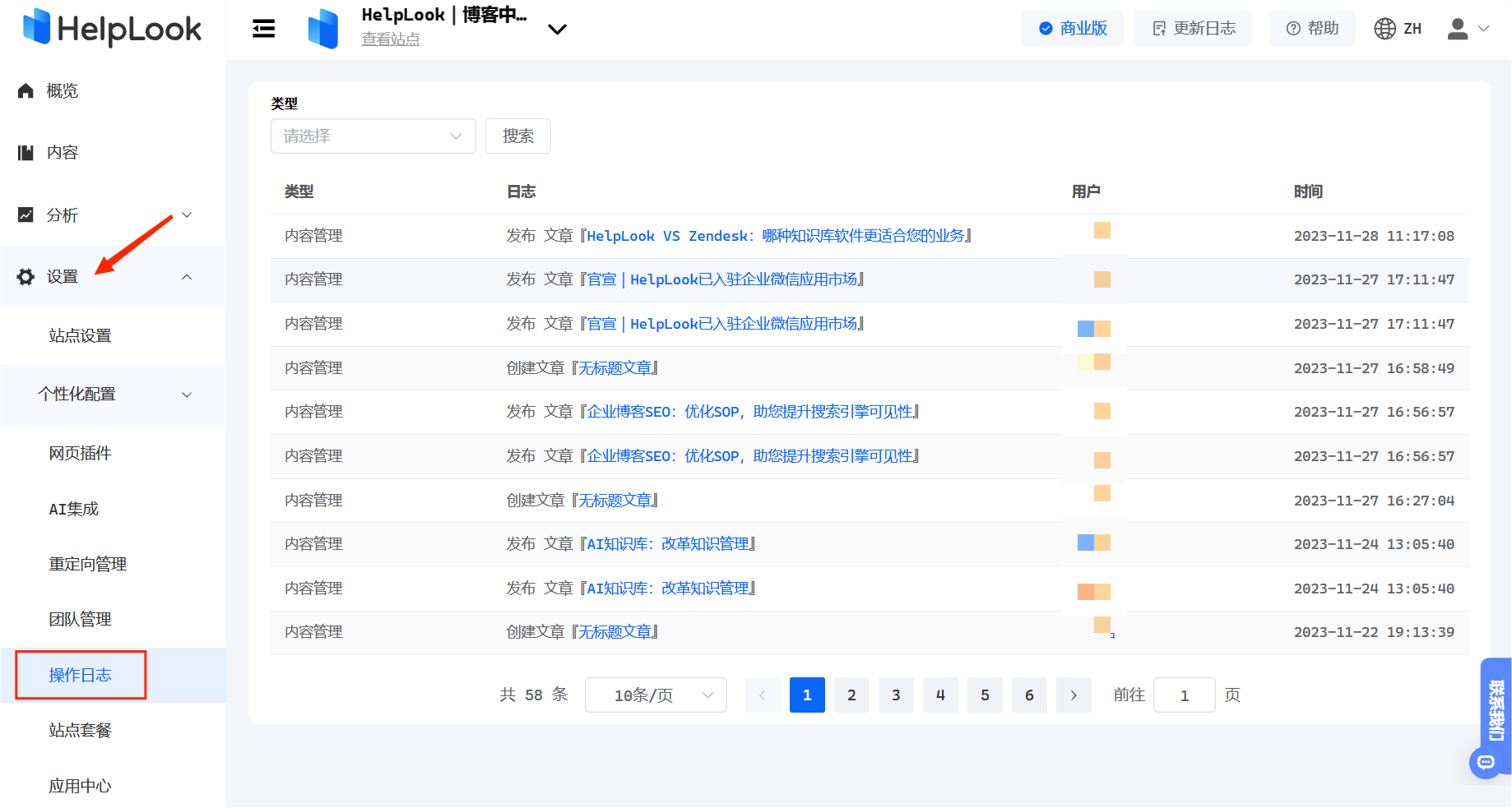 【功能说明】:操作日志可以查看每个团队成员的行为,帮助您了解团队成员的活动和他们对知识库的贡献。