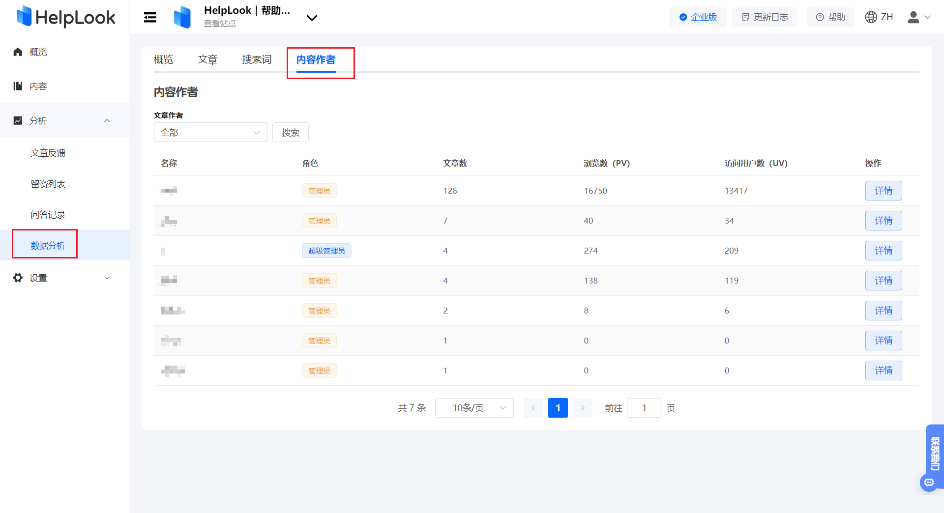【功能说明】:您可以查看所有内容创建作者的相关数据,包括作者的总创建文章数、总浏览量(PV)、总访问用户数(UV)等。该功能可以有效了解作者的表现和管理资源分配。