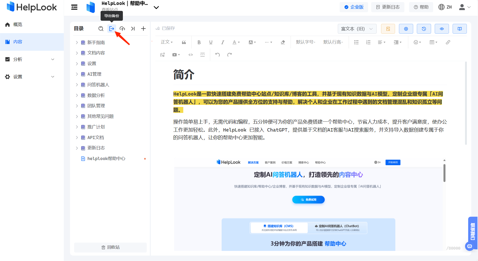 【查看路径】:内容->导出备份->导出为HTML,选“全部”,下载全站 HTML