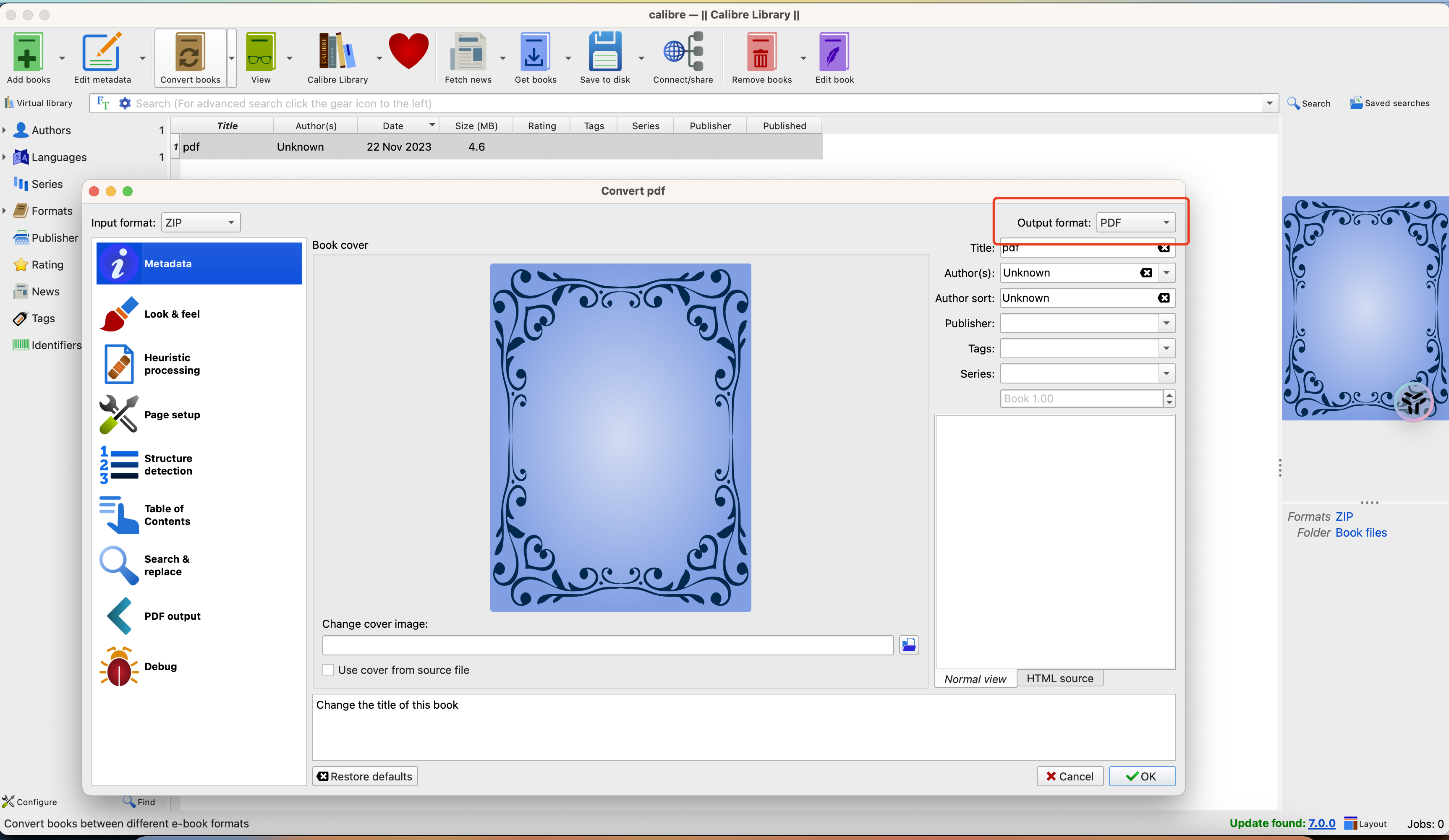 - 点击“Convert books”, “Output format”选择“PDF”,再点击“OK”
