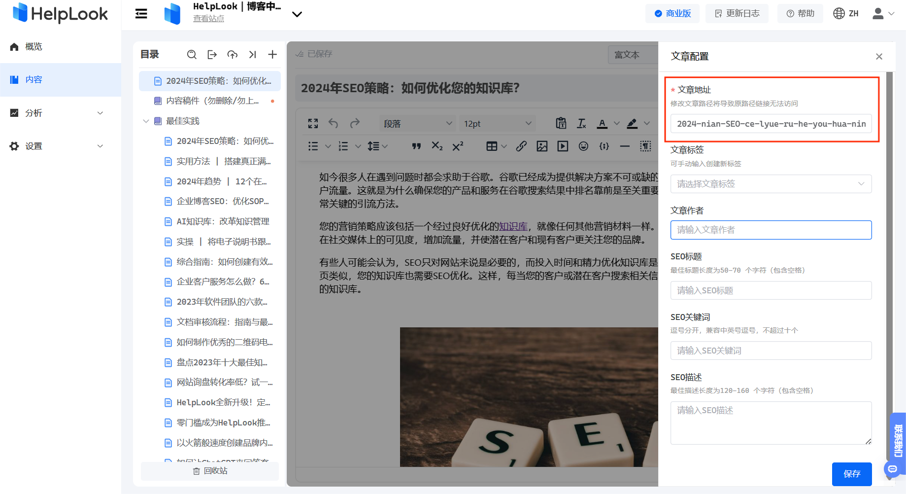 【功能说明】:编辑文章配置时,您无需手动输入URL,点击发布之后,URL会根据文章标题自动生成。