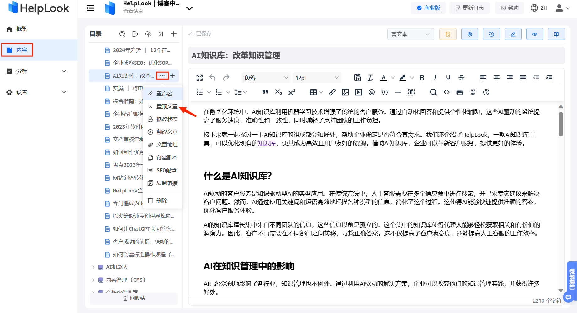 【查看路径】:在博客中心站点后台点击内容->单篇文章“···”->置顶文章