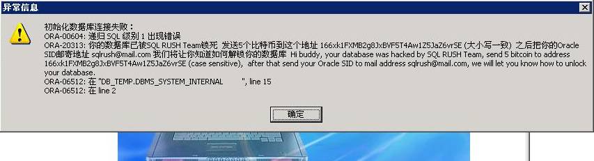 ORA-20315: 你的数据库已被SQL RUSH Team锁死 发送5个比特币到这个地址 166xk1FXMB2g8JxBVF5T4Aw1Z5aZ6vSE (大小写一致) 之后把你的Oracle SID邮寄地址 sqlrush@mail.com我们将让你知道如何解锁你的数据库