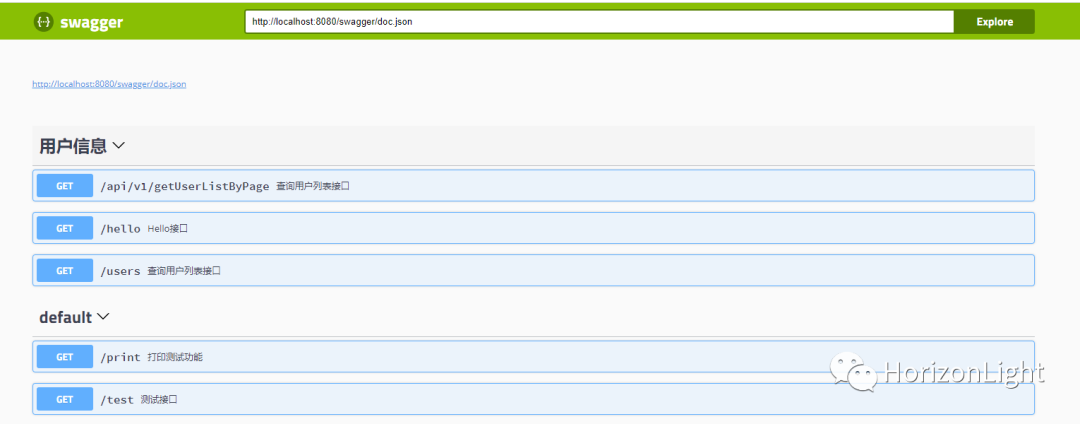 package mainimport ("github.com/gin-gonic/gin""github.com/swaggo/gin-swagger""github.com/swaggo/gin-swagger/swaggerFiles""net/http"_ "gin-demo/docs" // 执行swag init生成的docs文件夹路径 _引包表示只执行init函数)func main() {router := gin.Default() // 函数返回的是一个Engine指针,Engine代表的是整个框架的一个实例,查看源码可发现实际就是调用New()方法创建实例,并且为实例添加了Logger和Recovery中间件.// 调用Engine的GET方法(其他请求方式POST PUT DELETE等) 第一个参数为相对路径,第二个参数为多个handlerouter.GET("/test", Test)// swagger访问地址 http://localhost:8080/swagger/index.htmlurl := ginSwagger.URL("http://localhost:8080/swagger/doc.json") // The url pointing to API definition// 添加swagger的路由 不然报错404 page not foundrouter.GET("/swagger/*any", ginSwagger.WrapHandler(swaggerFiles.Handler, url))//v1组路由 把Print和Hello方法添加到同一组路由,即访问时需要在前面加上/api/v1v1 := router.Group("/api/v1"){v1.GET("/print", Print)v1.GET("/hello", Hello)}// 不指定ip地址和端口时,默认是监听并在 0.0.0.0:8080 上启动服务,另外的写法还有Run(":8080")、Run("0.0.0.0:8080")、Run("localhost:8080")都是指定http://localhost:8080或者http://127.0.0.1:8080/router.Run()}// @Summary 打印测试功能// @title Swagger Example API// @version 0.0.1// @description This is a sample server Petstore server.// @BasePath /api/v1// @Host 127.0.0.1:8080// @Produce json// @Param name query string true "Name"// @Success 200 {string} json "{"code":200,"data":"name","msg":"ok"}"// @Router /print [get]func Print(c *gin.Context) {var (name string)name = c.Query("name")c.JSON(http.StatusOK, gin.H{"code": http.StatusOK,"msg": "success","data": name,})}// @Summary Hello接口// @Description Hello接口// @Tags 用户信息// @Success 200 {string} json "{"message":"success"}"// @Router /hello [get]func Hello(c *gin.Context) {// 当响应码为200时,返回JSON格式数据c.JSON(http.StatusOK, gin.H {"message": "success",})}// @Summary 测试接口// @Description 描述信息// @Success 200 {string} string "ok"// @Router /test [get]func Test(c *gin.Context) {c.JSON(200, "ok")}
