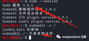 用户可以使用非root的账户登录系统,运行“ sudoedit -s / ”命令,若返回如图以“ sudoedit:”开头的错误,则当前系统可能存在安全风险。不受影响的系统将显示以“ usage:”开头的错误。