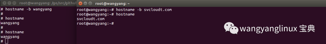 实验过程描述:先在子名称空间中(左图) 修改了主机名为 wangyang,之后执行主机名查看为 wangyang。然后在 父名称空间中(右图)修改了主机名为 svcloudt.com ,之后执行主机名查看为 svcloudt.com,之后在子名称空间中(左图)查看主机名依然为 wangyang。由此,可以证明外部的 hostname 并没有被内部的修改所影响