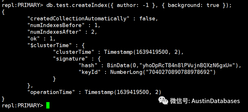 { "ts" : Timestamp(1639419500, 2), "t" : NumberLong(2), "h" : NumberLong(0), "v" : 2, "op" : "c", "ns" : "test.$cmd", "ui" : UUID("28a721ca-06b1-4c06-8588-efb0ef4fd21d"), "wall" : ISODate("2021-12-13T18:18:20.703Z"), "o" : { "createIndexes" : "test", "v" : 2, "key" : { "author" : -1 }, "name" : "author_-1", "background" : true } }