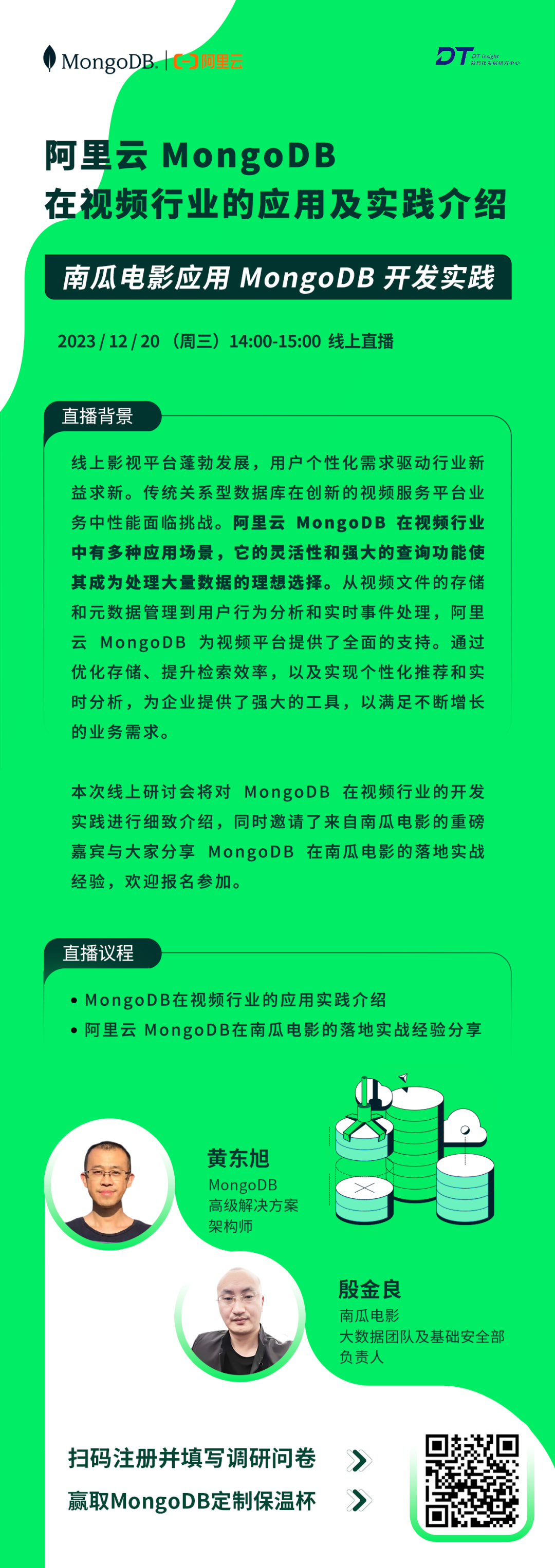 本周三下午两点,MongoDB携手阿里云带来MongoDB在视频行业的开发与实践线上研讨会,同时邀请了来自南瓜电影的重磅嘉宾与大家分享MongoDB在南瓜电影的落地实战经验,欢迎扫码或点击阅读原文报名参加。