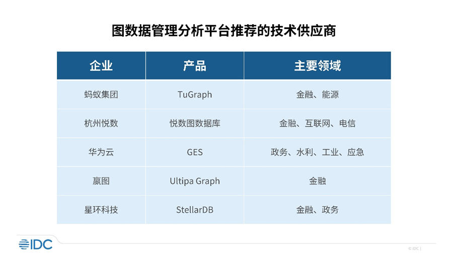在代表厂商推荐部分,IDC共列出蚂蚁集团TuGraph、杭州悦数图数据库、华为云GES、嬴图Ultipa Graph、星环科技StellarDB的5家公司产品,分析了其主要优势、产品能力和未来布局方向。