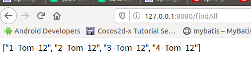 package com.wong.controller;import com.wong.mybatis.bean.Person;import com.wong.mybatis.service.PersonService;import org.springframework.beans.factory.annotation.Autowired;import org.springframework.web.bind.annotation.RequestMapping;import org.springframework.web.bind.annotation.RestController;import java.util.List;@RestControllerpublic class PersonController {// 通过@Autowired将PersonService的实例注入进来,其实就是PersonServiceImpl实例@Autowiredprivate PersonService personService;// add@RequestMapping(value = "/add")public String addStudents(){Person student = new Person();student.setName("Tom");student.setAge(12);int rs = personService.insertPerson(student);return "插入结果:"+rs;}// select@RequestMapping(value = "/findAll")public String findAllStudents(){List<Person> students = personService.selectAllPerson();students.stream().forEach(System.out::println);return students.toString()+"";}}