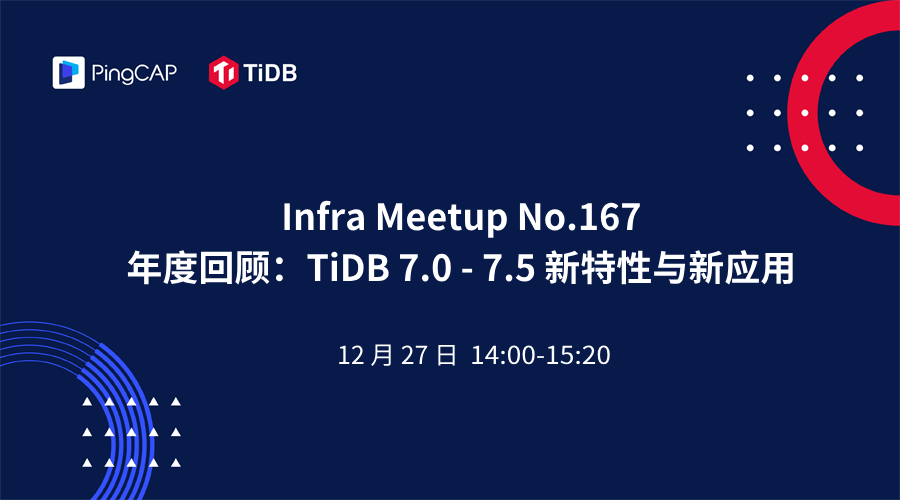 12 月 27 日下午 14:00-15:20,Infra Meetup No.167 上,我们将全面回顾 TiDB 在 2023 年推出的产品重大更新,分享用户对新版本的使用体验。PingCAP 数据库内核产品经理宋日杰将盘点 TiDB 7 系列版本发布的重要特性,并展望后续的技术发展路线;同时我们还邀请到两位 TiDB 的资深用户,分享新特性在实际场景中的应用实践。