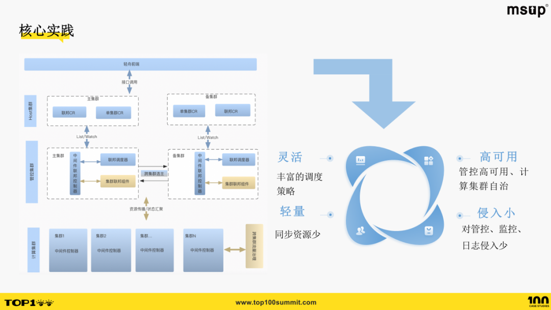 随着数智化的不断深入,企业业务负载,包括各大数据系统,都已经逐步迁移到云原生底座之上。而对于业务的长时间稳定运行所依赖的中间件高可用,具备分布式一致性的数据复制仍然是首选。此次大会上,网易数帆资深云原生架构师孟祥勇分享了一种更简洁高效的中间件同城跨机房高可用方案——通过云原生领域集群联邦组件,将一个中间件集群实例部署在多个计算集群,从而实现机房级别的容灾。