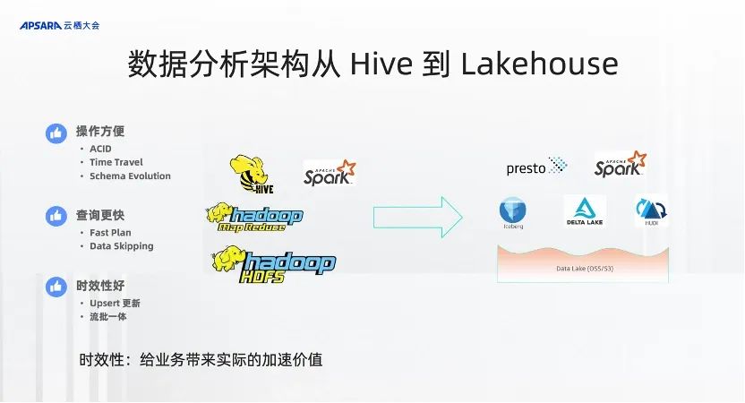 2. 第二个可能查询更快,比如说 plan 阶段会耗时更短,Hive 在超大数据量、超多文件的时候会有一些查询的问题。所以湖格式在这方面也会解决得更好。上面的两个好处不一定能打动公司的决策人,其实也不是每家公司都在升级或者都已经升级,其中一个大的原因是大家虽然说 Hive 老了,但它还是能再战一战的,因为前面这两个好处不一定对于每家公司都是刚需。大量的公司都还是继续用 Hive,也许底下的存储换成 OSS (或者 OSS-HDFS) ,但还是老的 Hive 那套。举例来说,现在已经有了运行稳定的火车,现在可以把它升级一下,增加餐车,装潢一遍,切分成更多节更灵活,但是需要升级为新的一套架构,你愿意冒着风险升级吗?但是如果能升级成高铁动车呢?所以我要介绍左边第三个好处。Lakehouse 可以做到时效性更好。
