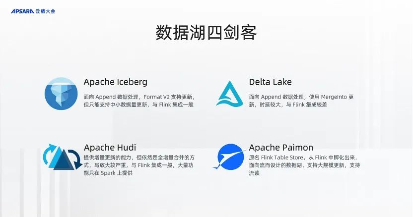 时效性在计算领域的领头羊是 Apache Flink。刚才说提升时效性是 Lakehouse 下一步的发展重点,现在要做的就是把 Streaming 计算标准技术也就是 Apache Flink 带到 Lakehouse 架构当中。所以前几年我们也做有很多相关的探索,包括在 Iceberg 和 Hudi 上的投入,都成功地把 Flink 和 Iceberg 的对接、和 Hudi 的对接打磨出来。但是可能打磨得效果也没有那么好,如果大家用过 Flink + Iceberg 或者 Flink + Hudi 可能也有一些吐槽。关键问题在于,Iceberg 和 Hudi 都是面向 Spark、面向离线而生的数据湖技术,与实时和 Flink 有着不太好的匹配。所以我们研发了新型数据湖格式 Apache Paimon,它是一个流式数据湖格式。我们分析一下数据湖四剑客有什么样的历史和初衷。