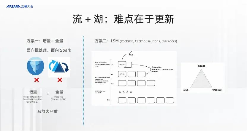 右边是面向更新的技术,LSM 全名是 Log Structured Merge-Tree,这种格式在实时领域已经被大量的各种数据库应用起来,包括 RocksDB、Clickhouse、Doris、StarRocks 等等。LSM 带来的变化是每次合并都可能是局部的。每次合并只用按照一定的策略来 merge 数据即可,这种格式能真正在成本、新鲜度和查询延时的三角 trade-off 中可以做到更强,而且在三角当中可以根据不同的参数做不一样的 trade-off 的选择。