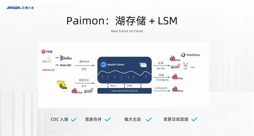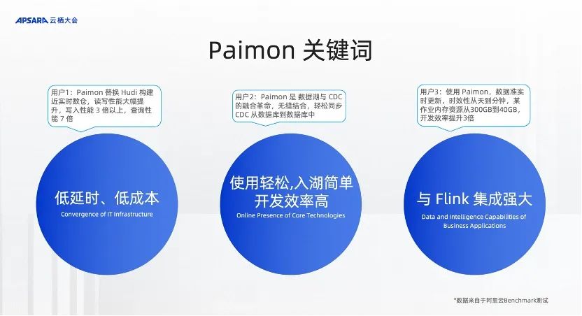 第一,低延时、低成本的流式数据湖。如果你有用过 Hudi,我们希望你替换到 Paimon 之后以 1/3 的资源来运行它。