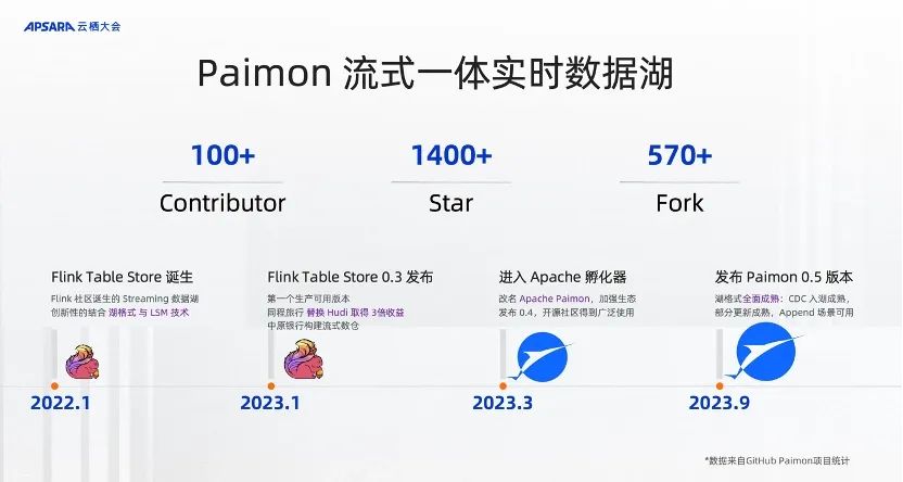 这是 Paimon 的架构图,这主要是 Paimon 流式一体实时数据湖大致的发展历程。最开始在 2022 年初发现了开源社区技术上的一块缺失,所以在 Flink 社区提出了 Flink Table Store。直到 2023 年 1 月发布了第一个稳定的版本0.3,3 月份进入 Apache 孵化器。今年 9 月份发布了 Paimon 0.5 版本,这是 Paimon 全面成熟的版本,包括 CDC 入湖和 Append 数据处理。