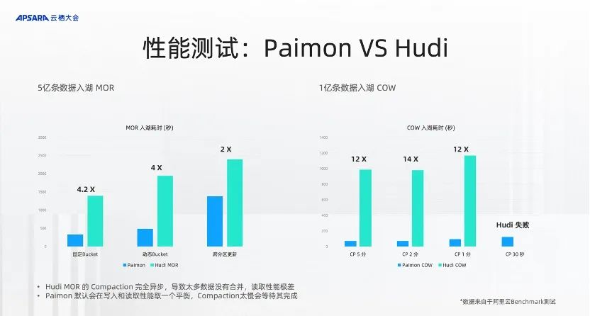 我们也在阿里云上测试 Apache Paimon 和 Hudi 的性能,测试湖存储的 MergeOnRead 的更新性能,可以看到左边是大致是 5 亿条数据入湖,按照类似的配置、相同的索引来入湖,我们来评估 5 亿条入湖需要多少时间。经过测试发现 Paimon 入湖的过程中,吞吐或者耗时能达到 Hudi 的 4 倍,但是查询相同的数据,发现 Paimon 的查询性能是 Hudi 的 10 倍甚至 20 倍,Hudi 还会碰到因内存变小而无法读取的情况。为什么呢?我们分析到,Hudi MOR 是纯 Append,虽然后台有 Compaction,但是完全不等 Compaction。所以在测试中 Hudi 的 Compaction 只做了一点点,读取的时候性能特别差。基于这点,我们也做了右边的 benchmark,就是 1 亿条数据的 CopyOnWrite,来测试合并性能,测试 CopyOnWrite 情况下的 Compaction 性能。测试的结果是发现不管是 2 分钟、1 分钟还是 30 秒,Paimon 性能都是大幅领先的,是 12 倍的性能差距。在 30 秒的时候,Hudi 跑不出来,Paimon 还是能比较正常地跑出来。(Checkpoint 到 10s 后,Paimon 也跑不出来了)