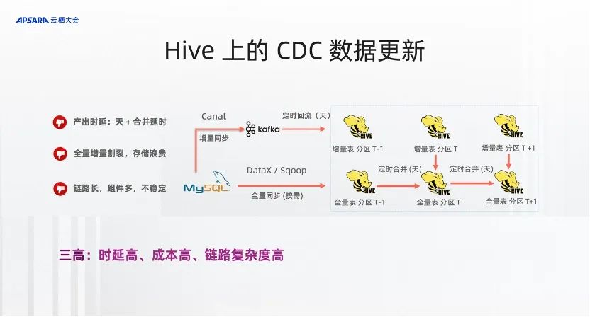 一个最典型的流式湖仓能解决的场景,Hive 上 CDC 数据,也就是从 MySQL、传统数据库的数据、CDC 数据能流到仓或者湖中的链路。这是一个比较陈旧,但是也是大量在企业中被应用的架构图。你可能在第一次运行的时候或者按需通过全量同步的方式同步到 Hive 全量分区表中,成为一个分区。接下来每天要通过增量同步的方式同步到 Kafka 中,通过定时回流的方式把增量的 CDC 数据同步成 Hive 中的一个增量表。每天晚上同步完后,大概 0 点 10 分的时候就可以做一个增量表和全量表的合并,合并之后形成新的分区就是 MySQL 新一天的全量。通过这样的技术可以看到它的产出时延是非常高的,至少需要 T+1,并且还要等增量数据和全量数据合并。而且全量增量是割裂的,存储也非常浪费。你可以看到Hive全量表每个分区就是一个全量的数据,你要存 100 天的数据就至少是 100 倍的存储。第三也是链路非常长,非常复杂,涉及到各种各样好几个技术,在真实的业务场景中非常容易遇到的就是这个产出,哪个组件有问题,数据产出不了,导致后面一系列的离线作业跑不了。所以这里描述的就是三高,时延高、成本高、链路复杂度高。