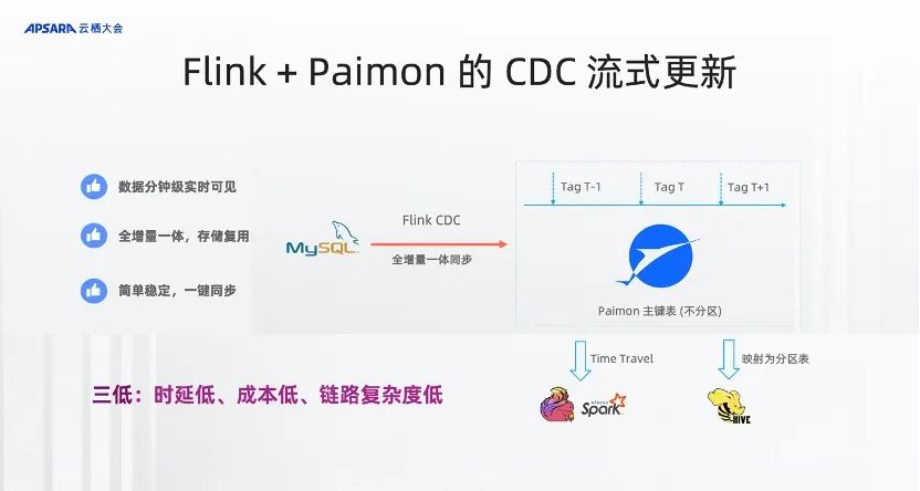 切到 Flink+Paimon 的流式 CDC 更新,我们希望把架构做得非常简单,不用 Hive 的分区表,只要定义 Paimon 的主键表,不分区。它的定义就非常像 MySQL 表的定义。通过 Flink CDC、Flink 作业把 CDC 数据全增量一体到 Paimon 中就够了,就可以实时看到这张表的状态,并且实时地查到这张表。数据被实时的同步,但是离线数仓是需要每天的 View,Paimon 要提供 Tag 技术。今天打了一个 Tag 就记住了今天的状态,每次读到这个 Tag 都是相同的数据,这个状态是不可变的。所以通过 Tag 技术能等同取代 Hive 全量表分区的作用,Flink、Spark 可以通过 Time Travel 的语法访问到 Tag 的数据。传统的 Hive 表那是分区表,Hive SQL 也没有 Time Travel 的语义,怎么办?在 Paimon 中也提供了 Tag 映射成 Hive 分区表的能力,还是可以在 Hive SQL 中通过分区查询,查询多天的数据。Hive SQL 是完全兼容一行不改的状态来查询到 Paimon 的组件表,所以经过这样的架构改造之后,你可以看到整个数据分钟级实时可见,各整个全增量一体化,存储是复用,比较简单稳定而且一键同步,这里不管是存储成本还是计算成本都可以大幅降低。存储成本通过 Paimon 的文件复用机制,你会发现打十天的 Tag 其实存储成本只有一两天的全量成本,所以保留 100 天的分区,最后存储成本可以达到 50 倍的节省。在计算成本上虽然需要维护 24 小时都在跑的流作业,但是你可以通过 Paimon 的异步 Compaction 的方式,尽可能地缩小同步的资源消耗,甚至 Paimon 也提供整库同步的类似功能给到你,可以通过一个作业同步上百张或者几百张表。所以整个链路能做到三低:时延低、成本低和链路复杂度低。接下来介绍两个流读。大家可能觉得 Paimon 是为实时而生的,更好地流读,其实没有什么实感。包括 Hudi、Iceberg 也能流读,我在这里通过两个机制来说明 Paimon 在数据流读上做了大量的工作。