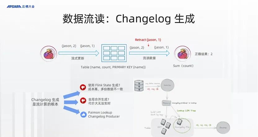 第二,Changelog 生成。假设有这样一张 Paimon 的 PK 表,Key 是名字,Value 是 Count,上游在不断地流写,下游在不断地流读。流写可能会同一个组件写相同的数据,比如说先前写的 Jason 是 1,后面又写一个 Jason 是 2。你会发现流读的作业在做一个正确流处理的时候,比如说做一个 sum,sum 结果应该是 2 还是 3,如果没有这个 Changelog 的生成就不知道这是同一个主键,我要先把 Jason -> 1 给 retract 掉,再写 Jason -> 2。所以这里也对我们湖存储本身要表现得像一个数据库生成 Binlog 的方式,下游的流读计算才能更好、更准确。Changelog 生成有哪些技术呢?在 Flink 实时流计算中,大家如果写过作业的话,也可能写过大量用 State 的方式来去重。但是这样的方式 State 的成本比较高,而且数据会存储多份,一致性也很难保障。或者你可以通过全量合并的方式,比如说 Delta、Hudi、Paimon 都提供了这样的方式,可以在全量合并的时候生成对应的 Changelog,这个可以,但是每次生成 Changelog 都需要全量合并,这个代价也会非常大。第三,Paimon 这边独有的方式,它有 Changelog-Producer=lookup,因为它是 LSM。LSM 是有点查的能力,所以你可以配置这样一个点查的方式在写入的时候能通过批量高效率的点查生成对应的 Changelog 让下游的流处理能够正确地流处理。上面两个部分就是 Paimon 的更新和流读。流式湖仓面向流批一体的 Flink 的流批一体。之前是流批一体的计算,现在有了存储以后是流批一体的计算 + 流批一体的存储。但是,有同学在用阿里云 Serverless Flink 发现没有批的基本能力:调度和工作流?流式湖仓不仅要解决流的能力,还需要解决批的离线处理能力,批是湖仓的基础,流只是在这个流式湖仓中真正的流可能只有 10%、20%,并不是整个湖仓的全部。所以 Flink 的流批一体离不开 Flink 的真正批处理。