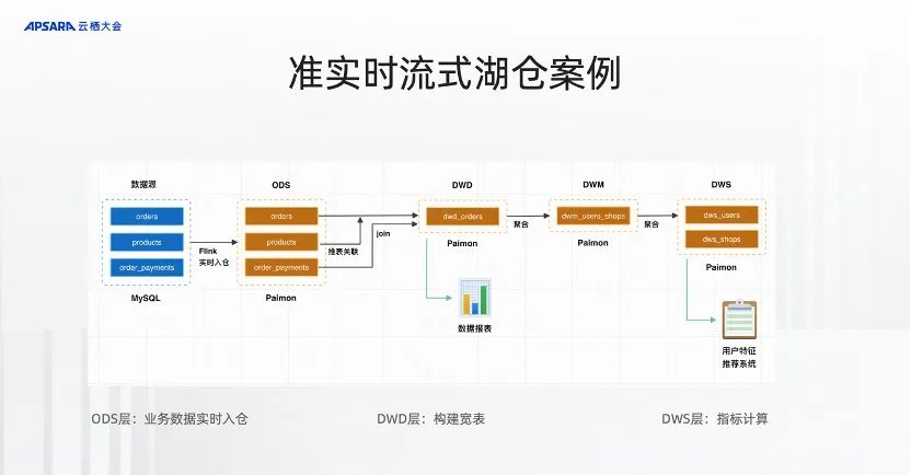 4. 第四步就是湖仓本质的东西批读批写,在产品上需要的东西基本上就是调度、工作流。大家期待已久,阿里云 Serverless Flink 也正式迎来了产品上的调度和工作流的能力,能让你在 Serverless Flink 达到真正的完整批处理链路的能力。接下来我就想通过一个准实时流式湖仓的案例,是电商的数据分析。通过 Flink 实时入湖入到 ODS 层 Paimon 表,通过流式流起来流到 DWD,再流到 DWM,再到 DWS,这样一整套完整的流式湖仓。