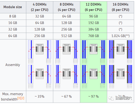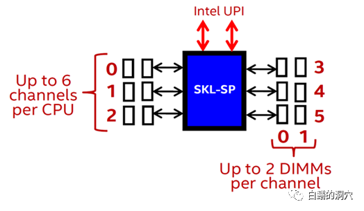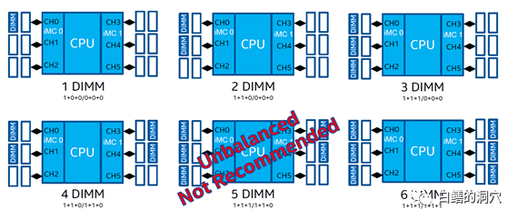 比如说skylake CPU支持2个内存控制器,每个内存控制器有3个通道,每个通道可以插两条内存条。只有当内存是按照平衡的方式插入到内存插槽中的时候,服务器的内存访问性能才能达到最佳。下面是一组平衡插法的示意图: