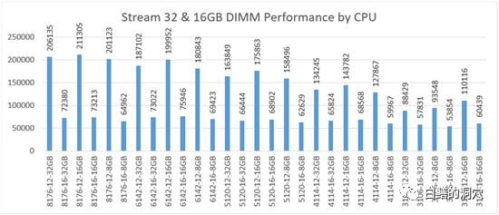 从上面的图上我们可以看出,针对任何一种SKYLAKE CPU,12条内存条和16条内存条的性能差异是相当大的。当然实际使用的情况并不一定如上述的数据那么糟糕,有可能我们的内存带宽并不需要达到那么高,对于那些不追求极致性能的普通的应用,或者说对于内存吞吐量要求并不大的系统来说,平时的影响并不大,不过对于内存访问要求较高的系统来说,更高的内存带宽对系统性能关系重大。
