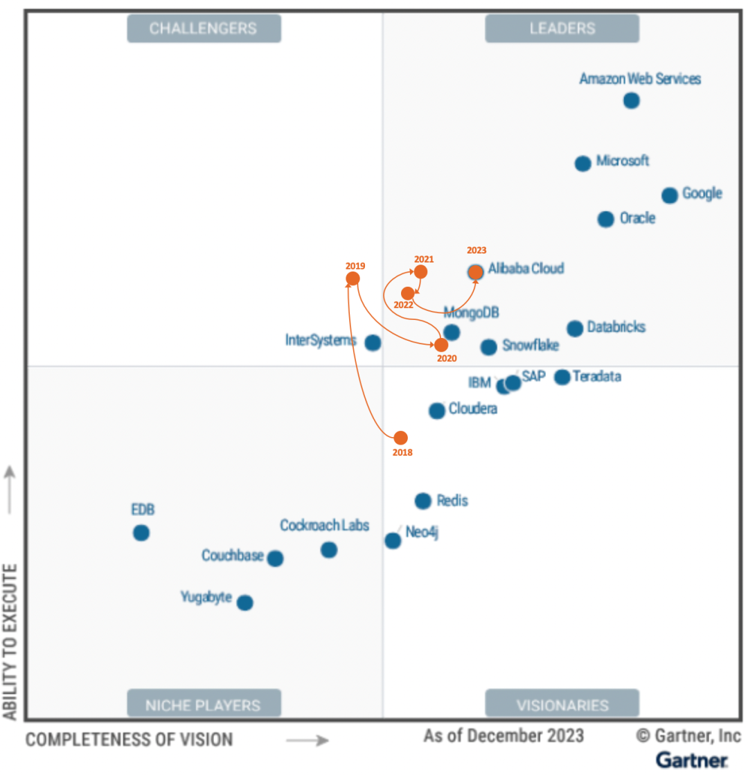 在今年的全球魔力象限中,中国厂商只剩下阿里云数据库在孤军奋战。在诸如SAP、IBM、Teradata等一众厂商均跌出领导者象限的背景下,阿里云数据库不仅稳居全球领导者,而且其位置相比于去年,无论是横纵坐标均有增强,这是非常了不起的。