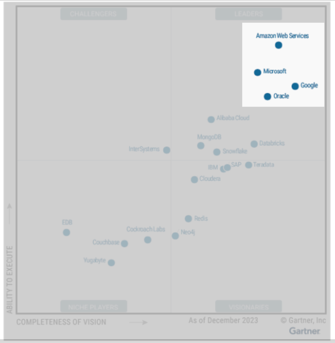 另一方面,也可以注意到,跌出领导者象限的厂商,其对应的云战略通常也是相对失败的,这则是“云计算”是如何重塑数据库领域的具体表现。