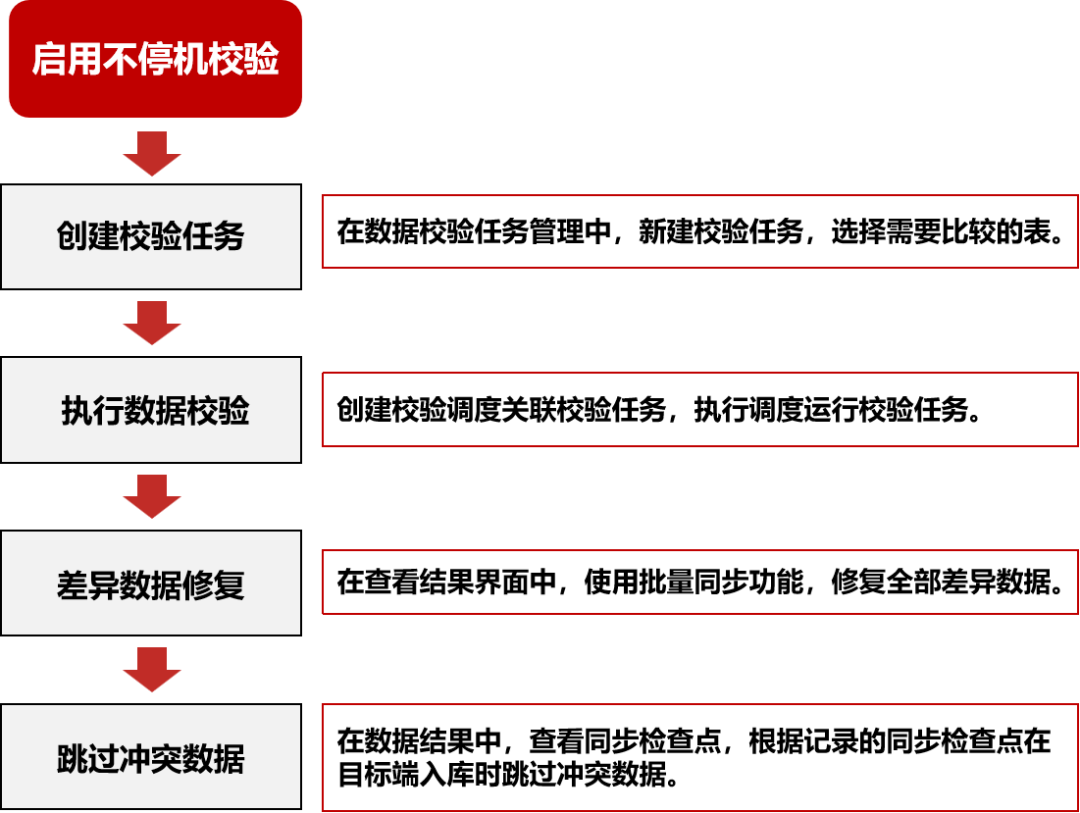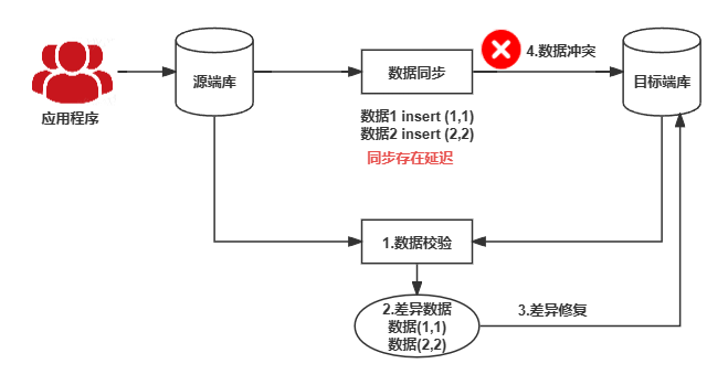 在数据同步过程中,为了保证数据的一致性,通常需要定期对数据进行校验,并对差异数据进行数据修复。而源和目标数据库的数据都随时在变化,源端有应用数据不断写入,目标端数据同步也在不断写入,并可能会存在同步延迟。
