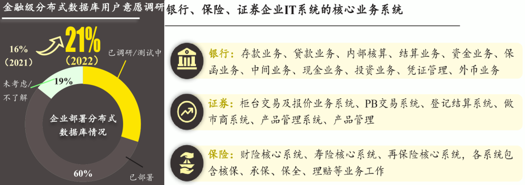 据沙利文调研数据,已调研或正在测试金融级分布式数据库企业比例得到提升,主要因为2021年未考虑/未了解的企业启动了金融级分布式数据库调研与测试。