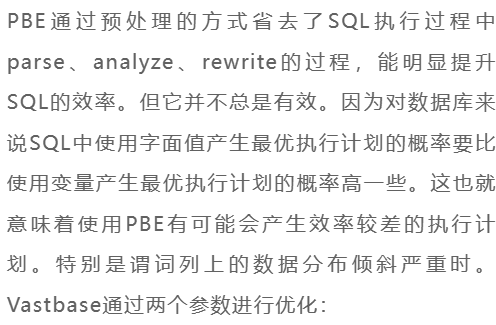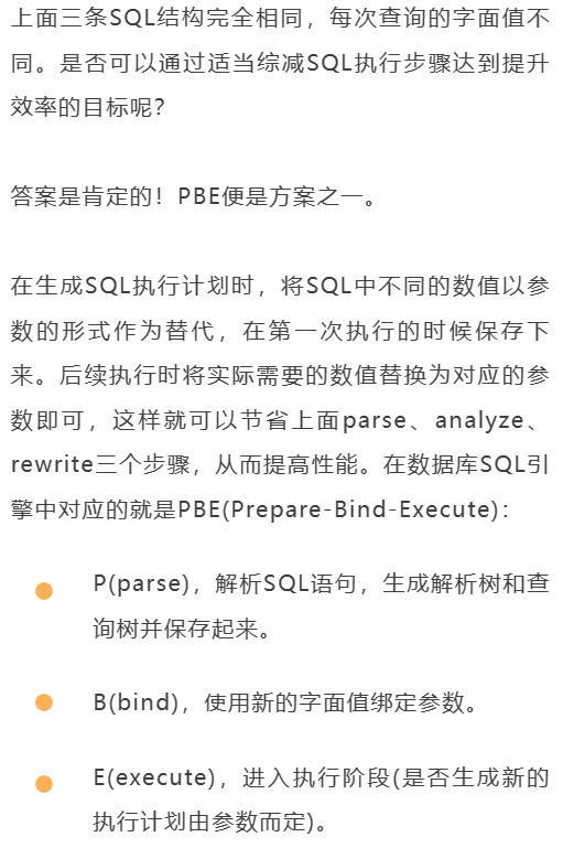 一个典型的SQL执行过程包括parse、analyze、rewrite、plan、execute等阶段。当一个SQL要执行多次时通过PBE则至少可以省略parse、analyze、rewrite等步骤,从而提升SQL执行效率。