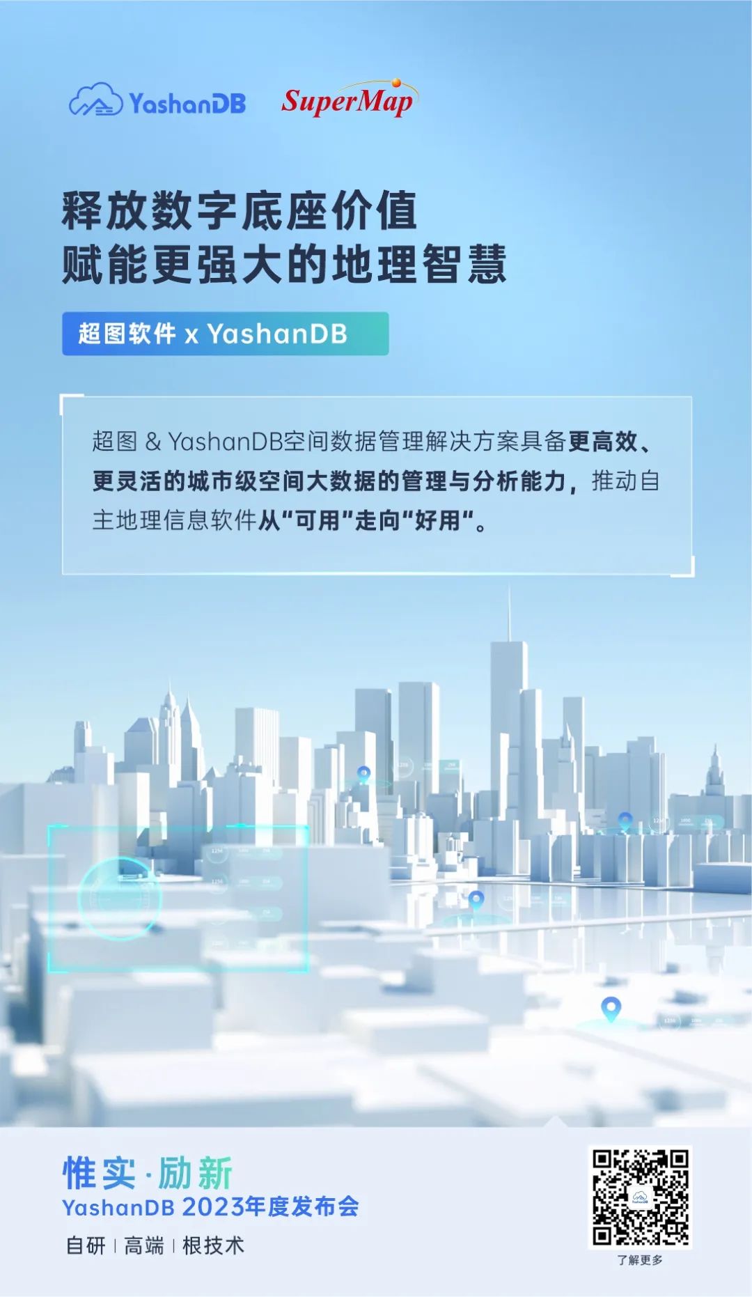 此次发布的解决方案以国产数据库系统YashanDB为底座、SuperMap GIS平台为支撑,内核代码自主率100%,全面适配国产化环境,具备丰富强大的GIS能力,包括空间数据大对象支持、免转换跨模融合查询、基于存算分离的高性能并行计算、多粒度空间数据安全保障等,为自然资源、智慧城市、生态环境等多个行业提供技术领先、自主可控、性能稳定的完整解决方案。