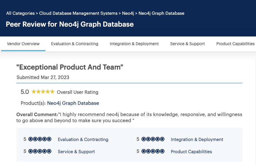 这些创新是由我们充满活力的开源社区(由超过 250,000 名开发人员和数据专业人员组成的)的需求和反馈推动的。这个全球社区也在 Gartner Peer Insights ™ 上发表了讲话,根据 2023 年 12 月 20 日的 112 条评论,Neo4j 的总体评分为 4.5 分(满分 5 分),我们认为这证明了强烈的客户满意度。2023 年 5 月,Gartner 云数据库管理系统客户之声,根据截至 2023 年 3 月 31 日的 23 条评论,100% 的客户愿意向其他人推荐我们——Neo4j 是报告中所有提供商中唯一获得 100% 评级的供应商。