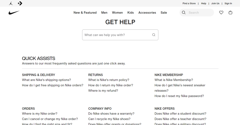 知识库本质上是网站上的信息宝库,或者说是其特定部分。它可以是wiki、详细的常见问题解答页面或相互连接的网页网络。以耐克(Nike)的官方帮助页面为例。