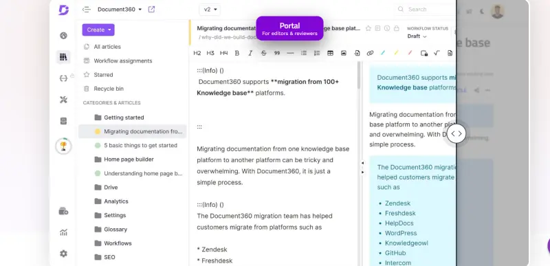 Document360提供了更高级的功能和特性,可以满足那些对知识库有更高要求的用户的需求。它提供用户友好的界面和强大的搜索功能。使用Document360,您可以轻松地创建内部知识库。值得注意的功能包括翻译功能和基于IP地址限制访问的能力。不过Document360的定价可能不适合小型企业。